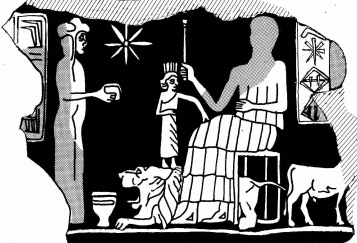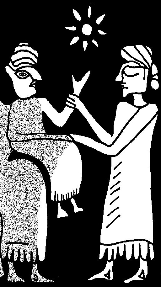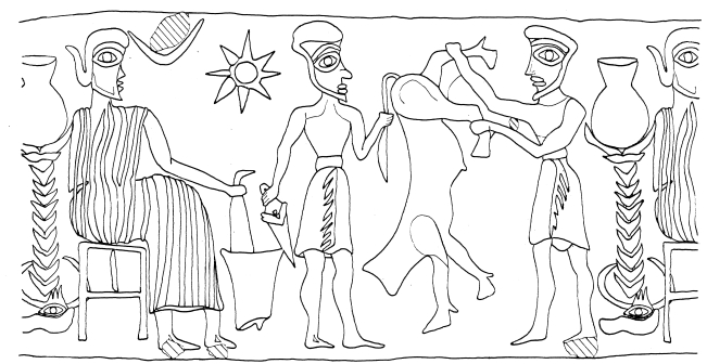 This gesture is also attested in the queen’s lyre scenes (TGL^qu4 above), where the extended arm of a smaller figure (likely a daughter) touches the queen’s lap. A similar configuration appears in the seal of Zamena (TGL^cu2),