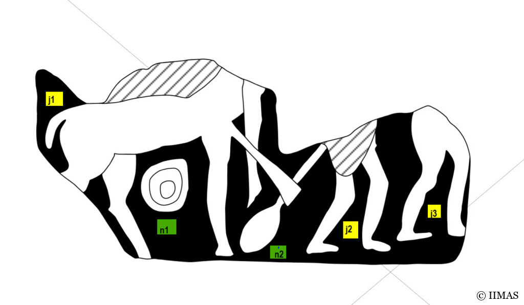 Iconographic definition, generic 2025-11-20 mKB standing animal facing right with unclear patterns in front and an unclear circular pattern below. Legs and lower bodies of two standing humans facing right but one may be holding behind a long pole which has a straight handle and an enlarged lower end in the shape of a modern paddle. [Input: ZJy20mKB A16si.J]