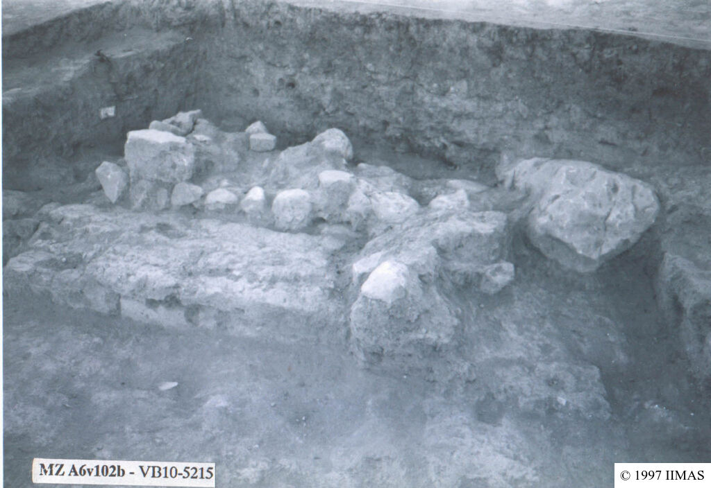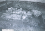 Argument 1997-06-19 rK a collection of stones with a smooth round broken stone in the middle, along with some sherds. A pot sits adjacent and immediately to the E of the stones and its rim is at the level of the stones. There is no evidence of a cut and we should conclude that the pot does not belong with the stones but is of an earlier stratum. [Input: H620RK.J]