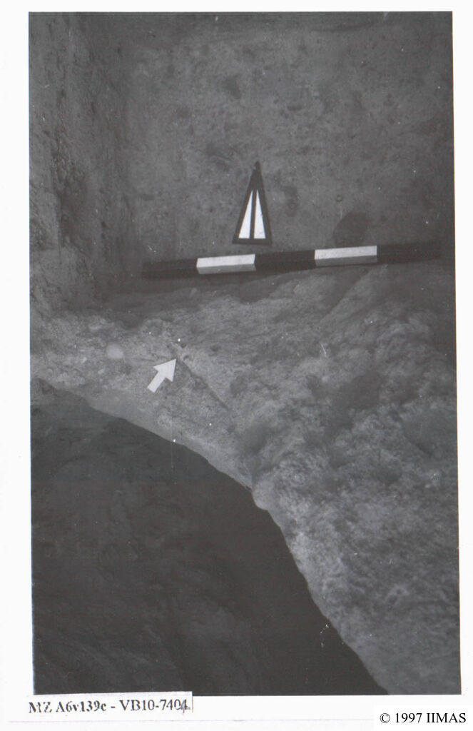| Argument | 1997-07-26 | dns | Excavation to clean up the pit f426 showed flat laid sherds underneath the lowest bricks of the tomb and also remains of tannur wall, decorated with shallowly impressed circles. This corresponds to a stage of occupation at the level of the top of the (secondary?) walls, f444. The pit had been cut into where f444 met f430. It is a possibility that the tannur fragments were contents of the pit. The burial f439 would then be later than the pit f426. But this seems unlikely since it is a layer of ash, and not the pit itself that seems to extend significantly under the tomb bricks. [Input: H726RK2.J] |
