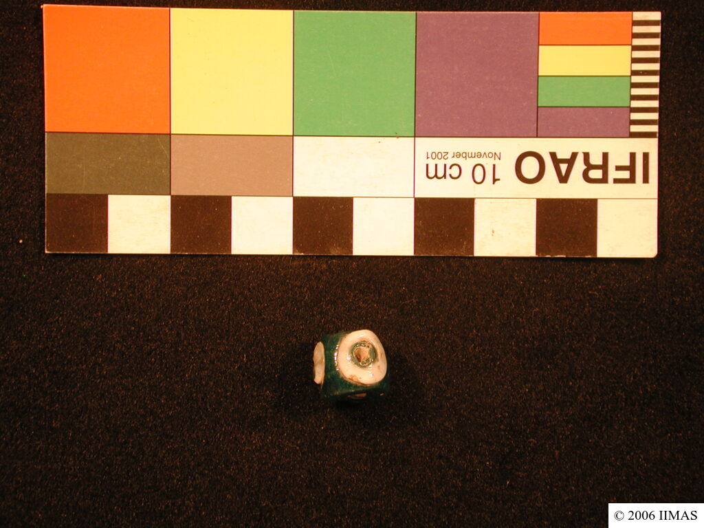 1x1x1 bead that appears like turquoise with white inlay on 4 sides into engraved depression. [Input: G806RK.J] |