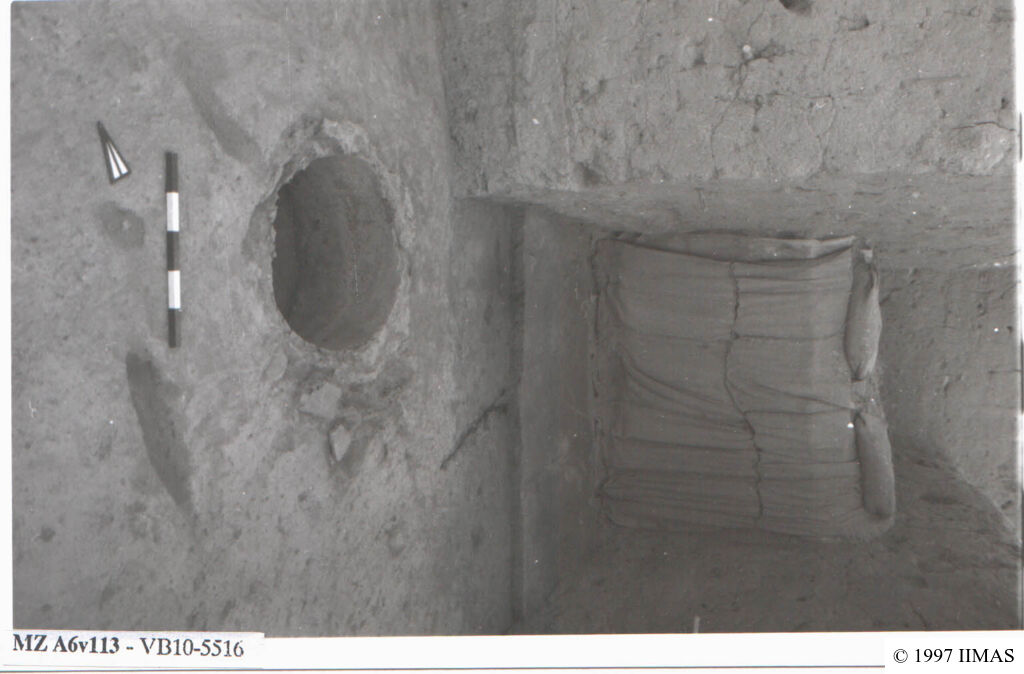 1997-07-17 dns This burial had been partially excavated during MZ9. It seems to have been a body placed in congealed brick, hard dirt. The cut of the pit was visible in profile (it is below the gypsum floor covering the tannurs) but a horizontal cut reveals no easy distinction. It has hard encasing but is not a tomb of bricks that have retained their shape. There were large sherds inside the grave, right on top of the bones. No other artifacts were seen. [Input: H726RK2.J]