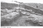 Presents the brickwall, f303, at the far right and has in view the platform, brick (f319) terminated by stone (f314) that adjoins it. The closeup shows the pot-smash, f312, which was subsequently recovered for assembly. Isolated stones on the floor are also visible. [Input: H625RK.J] |