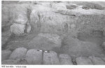 Shows the brick wall f303 and the associated pot smash f312 and the stone bench f314 which belongs to the lower floor f313. f312 was collected as i203 with the intent of restoration. [Input: H620RK.J] |