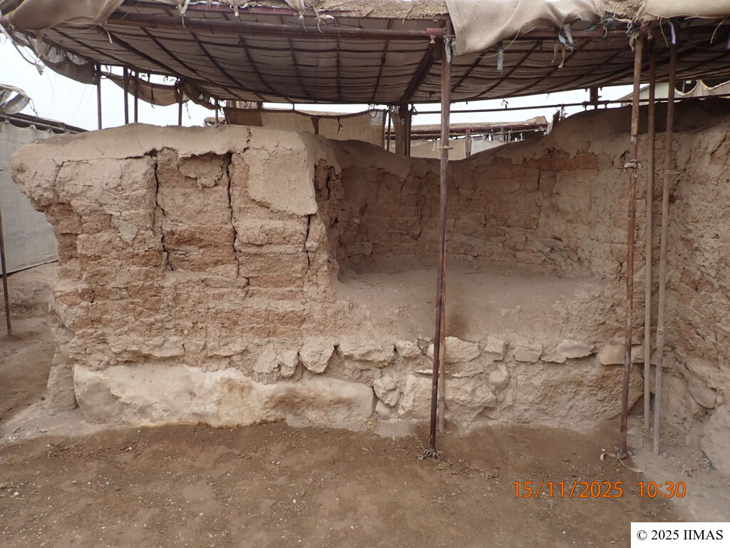 There are losses in the plaster layer on the right side of the wall, which probably caused the loss in mud bricks now visible in the middle section of that part of the wall. The cracks seem wider than last year. The stone foundation is in a good condition.