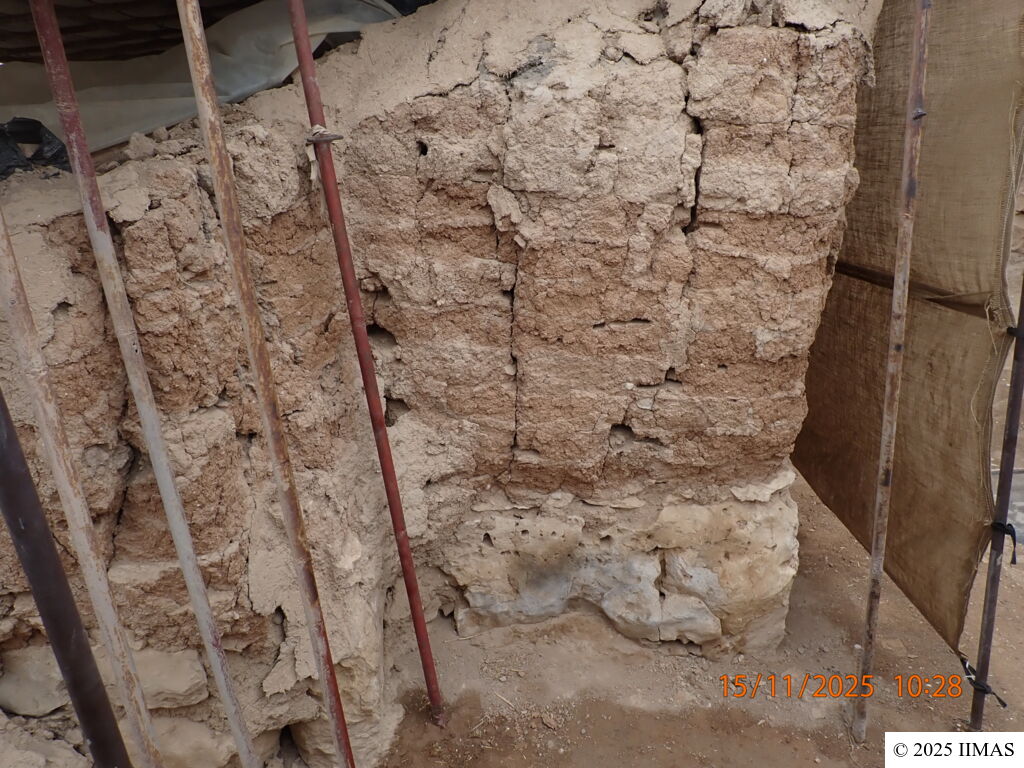 The wall appears dry and has subjected slight loss of plaster in the mud-brick section, with limited erosion on its left side. No noticeable widening of cracks was observed compared to the previous year. The red mud bricks are highly friable, as is the case with all the walls, while the stone foundation remains in good condition.