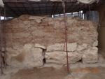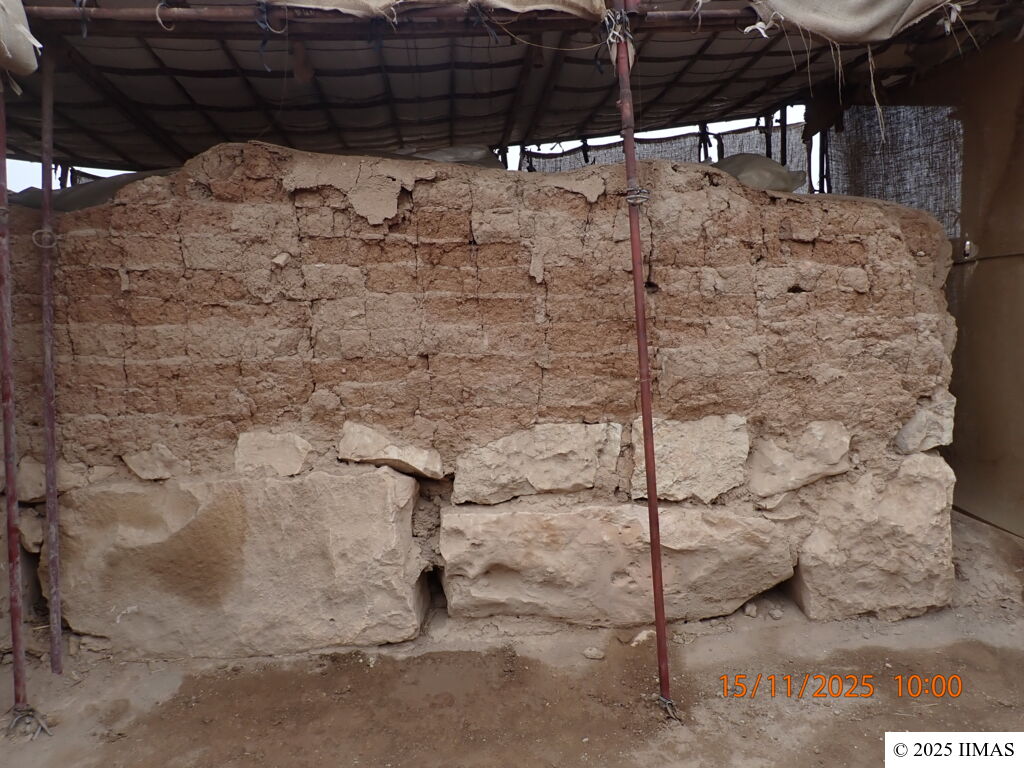 The wall has lost part of its plaster layer, as well as some mud brick on the upper right side and the upper left corner of the mud-brick section. The stone foundation is in good condition, with no loss of stones.