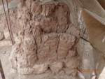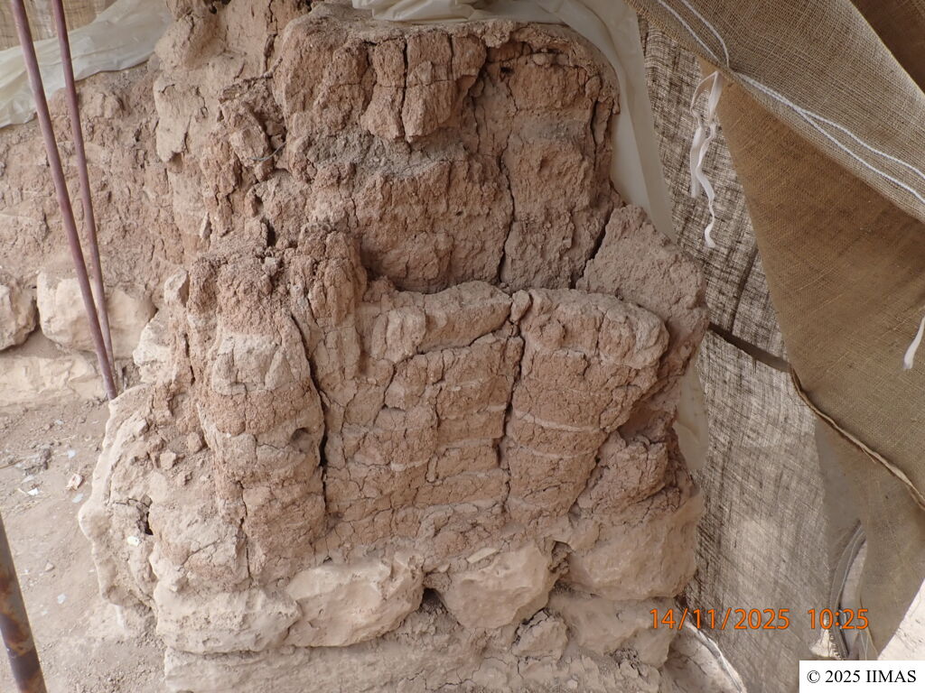 The entrance between rooms C5 and C7 was narrowed at a later phase, after the palace’s original function was abandoned, by building a gray mud brick wall in front of the original wall. In 2017, the wall lost the added section. Its current condition is fragile and crumbling, and the cracks appear unstable, which may lead to further loss of mud brick. A slight loss of bricks is also noted compared to last year.
