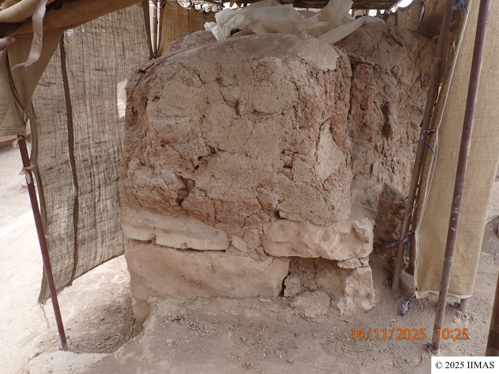 The wall surface subjected to erosion in 2016 and 2017, eventually leading to its collapse. It is important to note that the collapsed section does not belong to the original structure but to a reconstructed part added later after the palace’s primary function was abandoned. In contrast, the original wall appears to be in good condition, with no changes compared to last year.