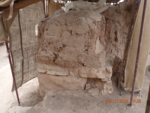 There have been large losses to the south face of the doorway, with sections of the outer surface lost. The ancient plaster which narrows the doorway is separating from the mudbricks, and a large portion has been lost. There is crumbling of the exposed inner surface of the bricks, especially in the areas most exposed to the elements (August 2010, E. Drolet)