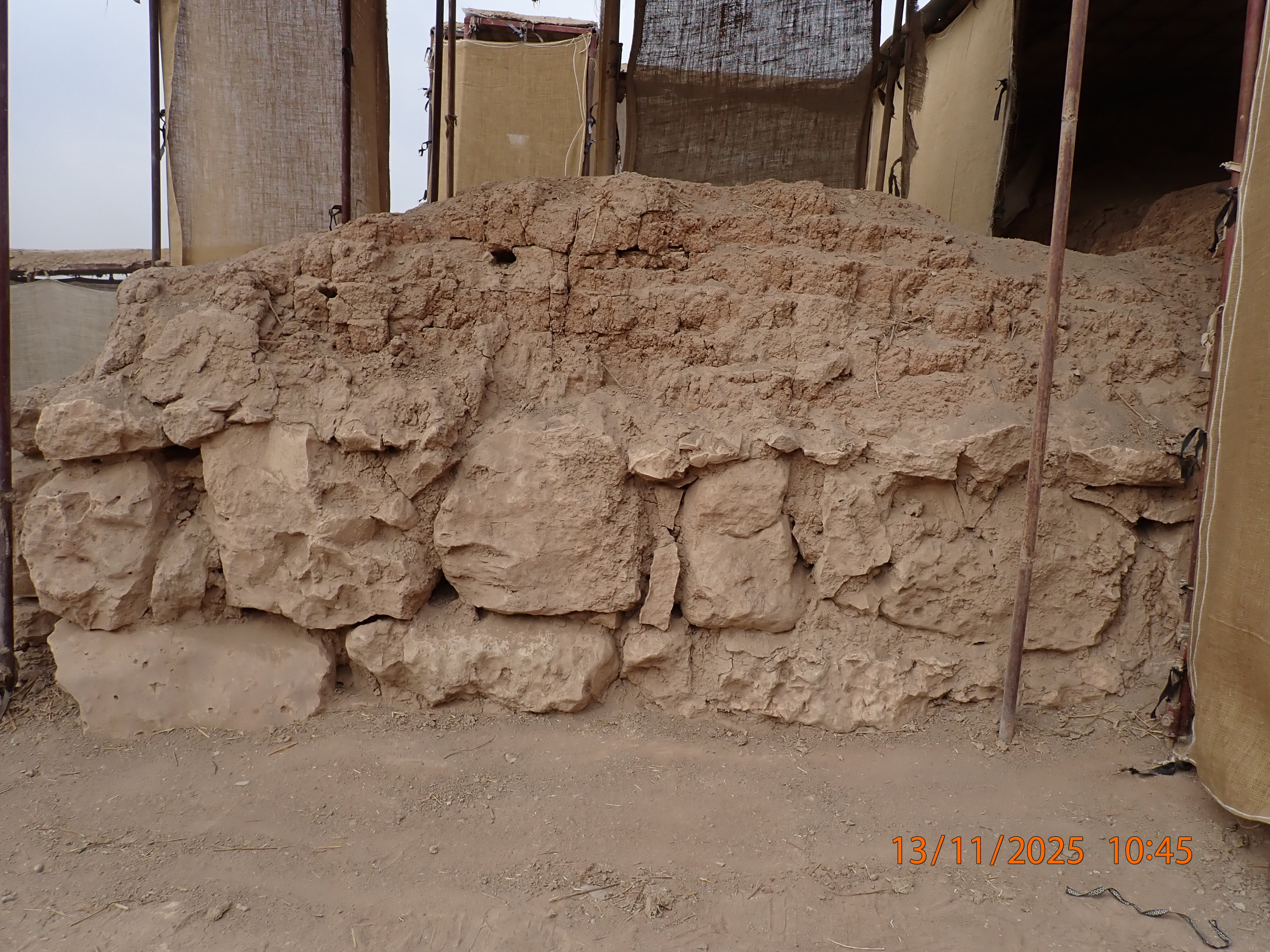 Compared to previous years, the upper portion of the wall, constructed of mudbrick, has remained fragile since excavation. Additionally, the wall shows signs of flaking, with slight erosion of the mud plaster in the central and left sections of the mudbrick part. The stone foundation is in good condition. Overall, the wall is relatively well preserved.