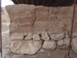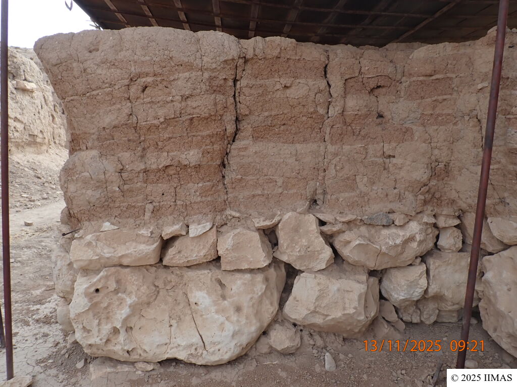 No significant widening of cracks is observed in the upper mud-brick section, although slight crumbling is visible in the upper right corner. The lower stone section shows no notable changes compared to the previous year. Overall, the wall is in good condition.