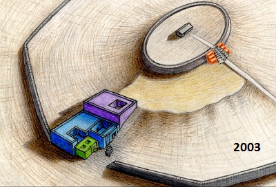 The initial strategy for Unit J4 was based on presuppositions that turned out to be incorrect. I will elucidate them here in order to explain both the nature of the excavations and the eventual shift from J4 to J6. The basic assumption was crystallized in the reconstruction shown in the drawing to the right (realized by Paola Pesaresi), wherein I projected a parallel staircase and apron to the east. |