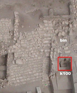 The decisive proof that my assumption was wrong came from the excavations of k100 (the square in red in the photo to the right). We reached a level lower than the matching level of the apron to the west, and we found no trace of stones nor any evidence that the stones might have been removed. Two other factors militated against the specular hypothesis. First, the diagonal wall (in yellow above) did not continue to the south. A second counterargument also emerged, more subtle in nature but very significant for a broader understanding of the general situation. The bin f93 showed a marked difference in use between the area to the west (devoid of any such structures) and the one to the east. It gave evidence of a difference in use in the area immediately adjacent to the staircase, and thus explained the nature of the wall flanking the staircase (in black above) as delmiting more sharply the ceremonial area to the west from teh use area to the east. |
