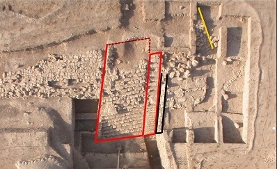 The main reason for this assumption was the existence of a diagonal wall to the east (in yellow) that seemed indeed specular to the alignment of the western apron and staircase (in red). It was by projecting this line all the way to the south that I assumed there would be a symmetrical staircase with apron to the east. The main difficulty with this hypothesis was the wall (in black) of which, when we started the excavations in J4, only the western face was showing. In the projection (drawing above), we projected a cuneus at the base of the staircase – admittedly not a very likely solution. |