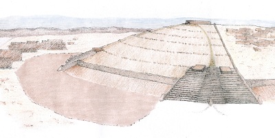 | These conclusions set the stage for a wider operation, the one that started in 2008 as J6. Originally aimed at exploring the area south of J4, it became apparent that the continuity to gthe north, along the staircase and thus across J4, constituted an organic whole that was best excavated as a unit. Hence J6 came to subsume J4. The skletch shows the reconstruction of the Temple Terrace after two seasons' work in the new unit. | ![]() |