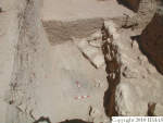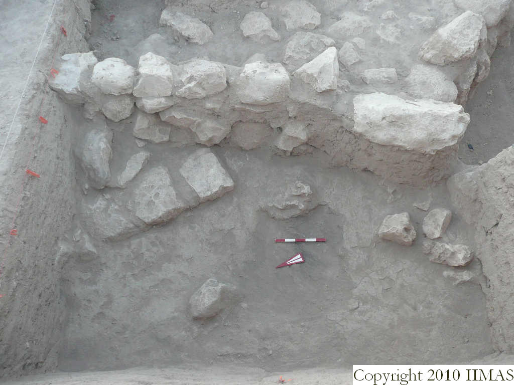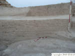 We traced the excarpment from the northwest corner of the locus where it was first discovered, south along the outer face of wall, f41, to which it belongs. The soil above the escarpment was defined as mixed since it was deposited by a combination of backdirt from locus k100 and aeolian soil deposited since the revetment wall system was first excavated several seasons ago. As a result the pottery will tell us little about when the excarpment was built and used. [Input: S814JW.j] |