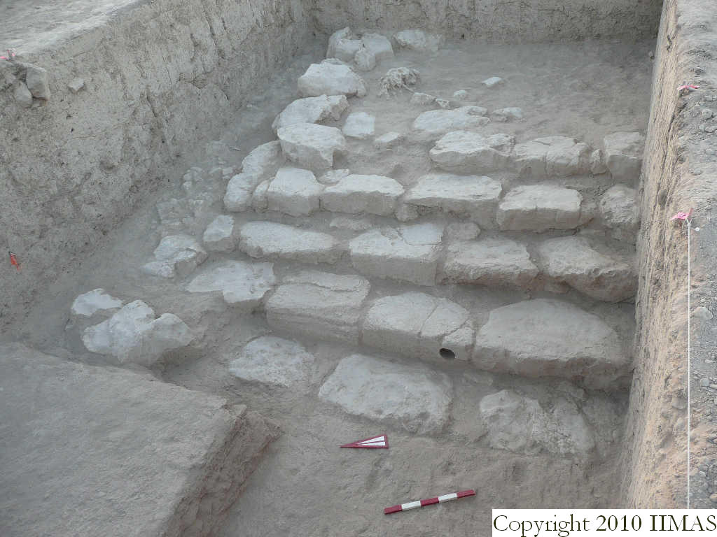 We started to excavate the southwestern quadrant of this locus, by removing the natural accumulation, f52. We found at least two steps below and to the west of the original stones of f21. The new steps are made of large dressed stones. [Input: S722LH1.j] |