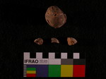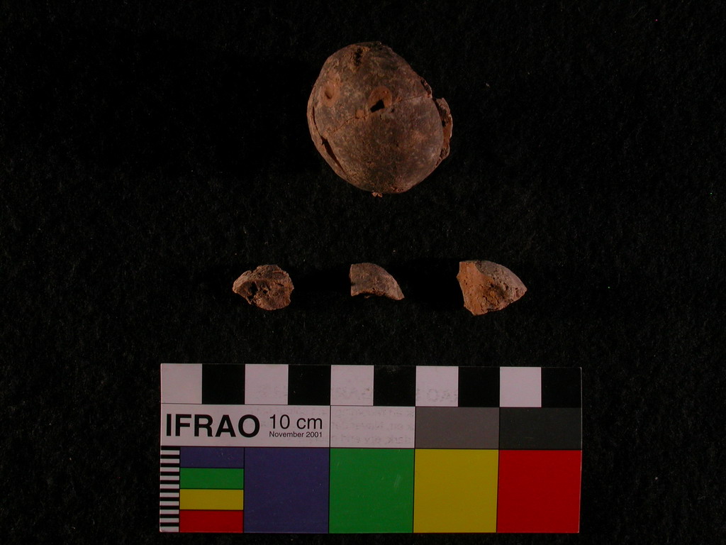 Eight fragments of a burned clay slingball which was found on an EDIII pavement during a stratigraphic review. We do not know if the ball was part of the floor, the deposit above it, or fell onto the floor from a higher stratum. [Input: T831SE.j] |