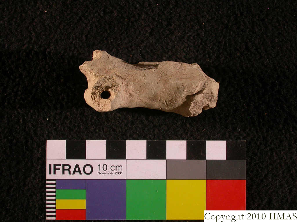 It is a chariot with one complete axle hole. One the top of body there is the imprint of a tool and in the middle there is a hole, perhaps used to tie this to an animal figurine.