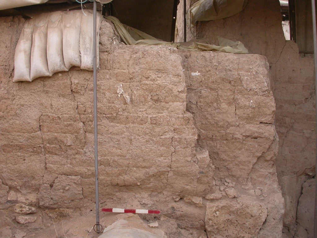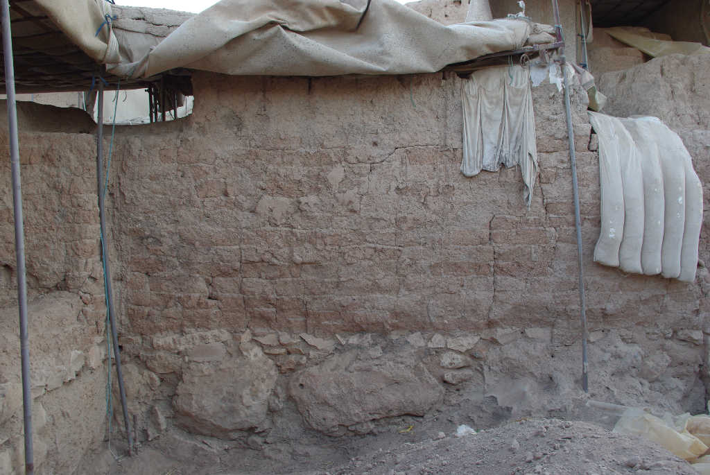 The stones are in good shape, there are some cracks in the middle and on the right side. No changes on the formed vertical crack on the far-left part of the wall. Some loss in the mud brick layer. Overall, no changes at the wall.