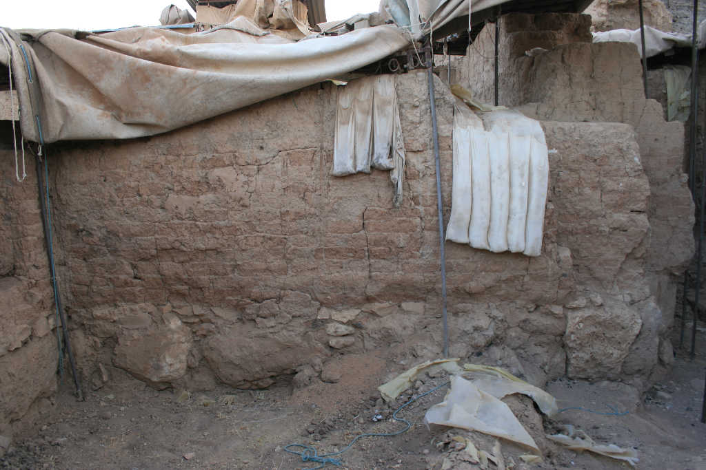 The eastern half of this wall is in very poor condition, and the entire right edge has been lost. The remaining section on the left is badly gapped and despite previous repair attempts is now being held in place only by the bisacce and the pole of the covering. Will suffer major damages if not addressed (August 2010, E. Drolet)