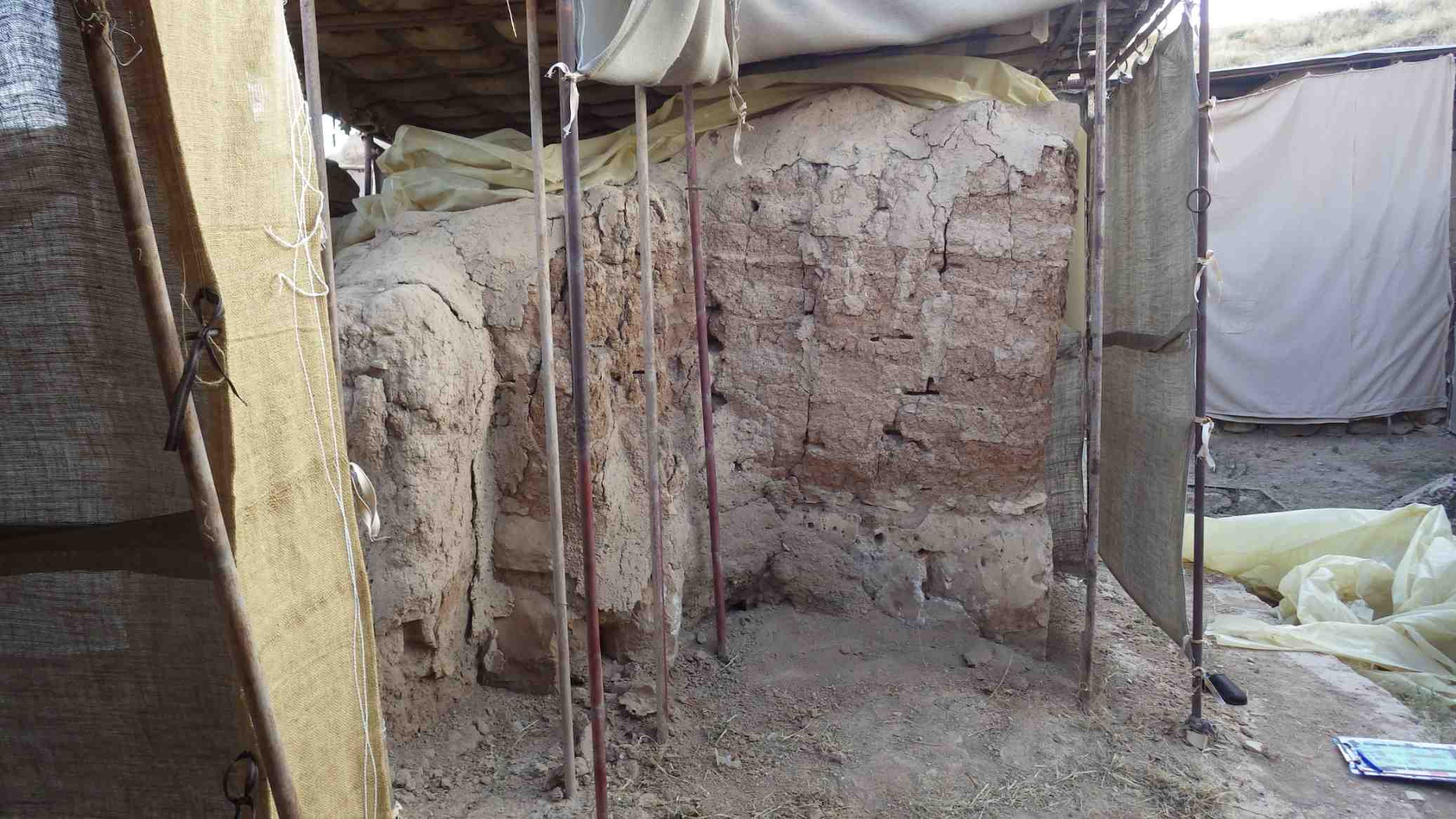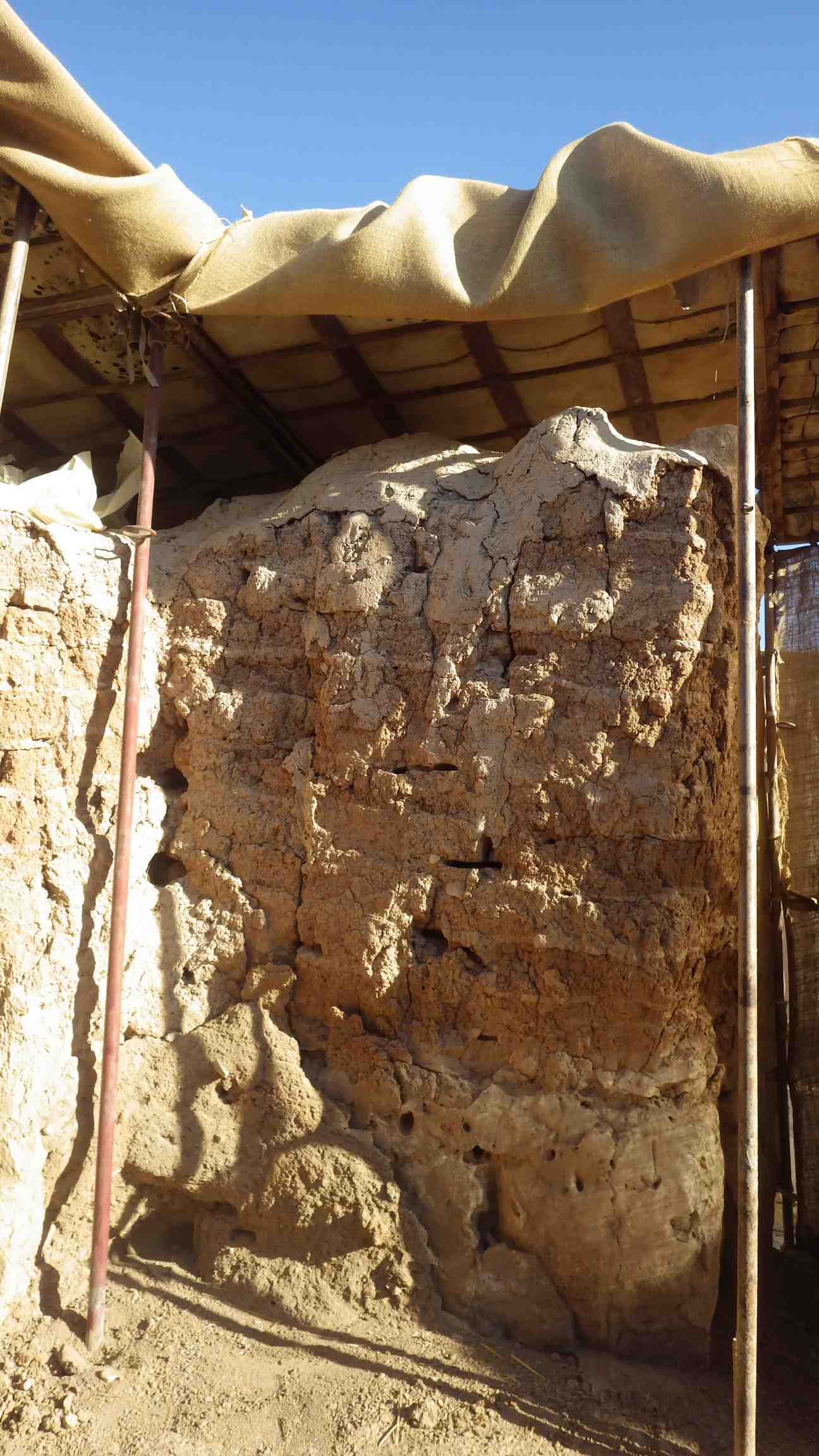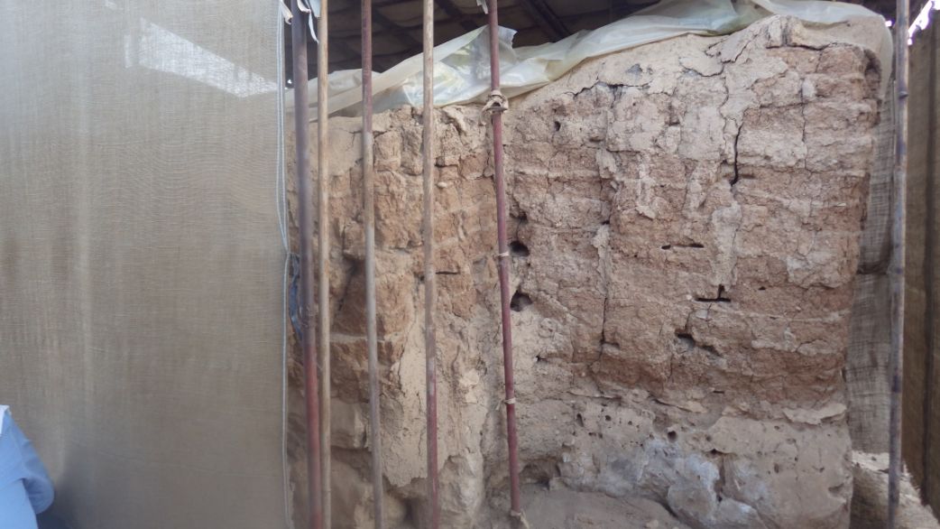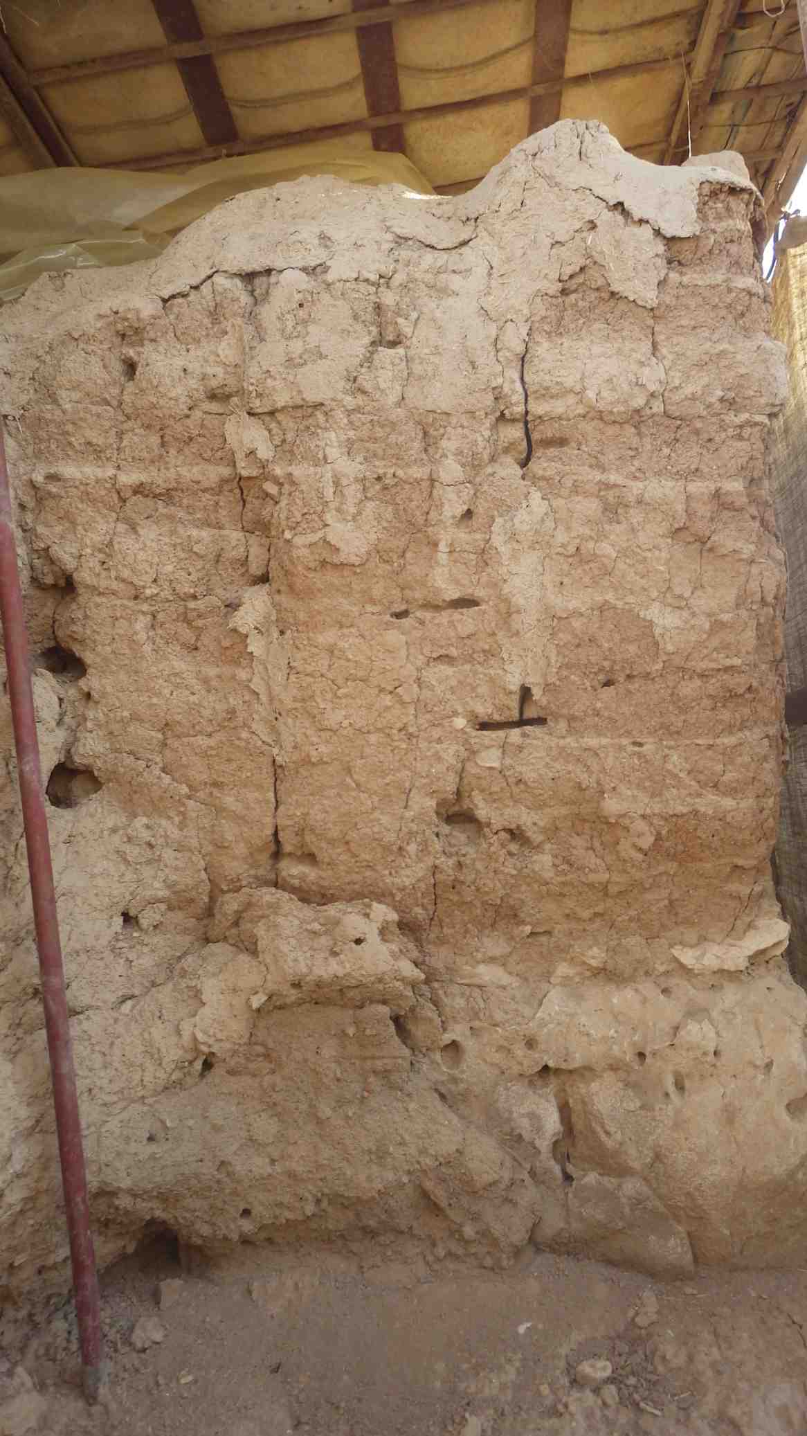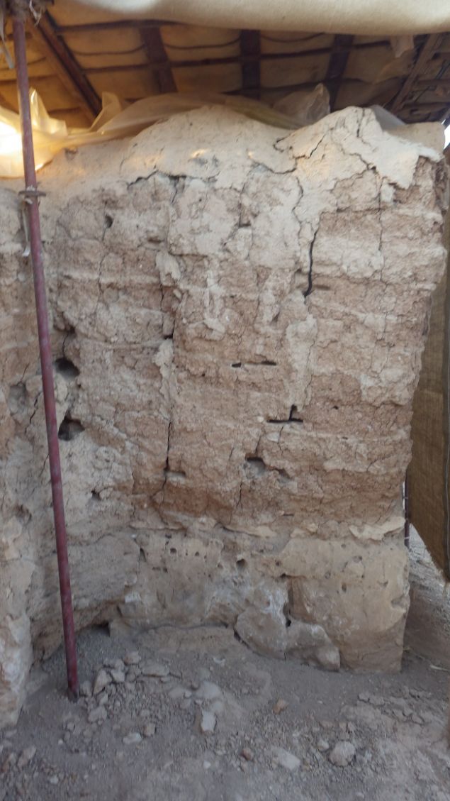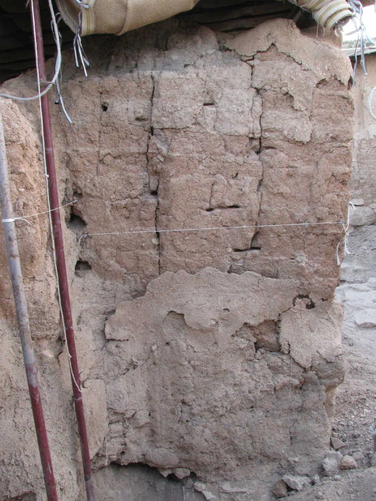 The wall is dry and fragile, there are cracks and holes, the mud plaster has eroded.