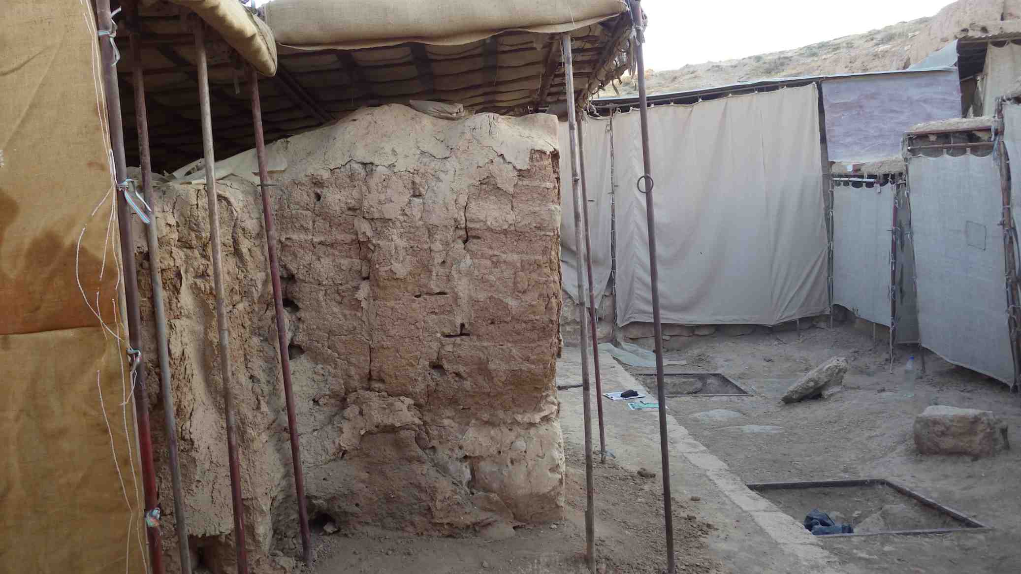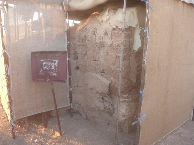The wall is dry and there are cracks and holes, the mud plaster has slightly eroded.
