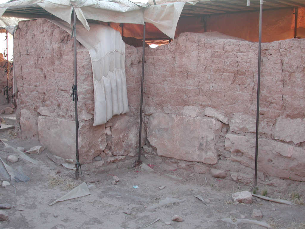 The wall is in fairly good shape. The major damage is to the center, which has eroded, and to the narrowing of the doorway, which is crumbling and detached. The large cracks have expanded (August 2010, E. Drolet)