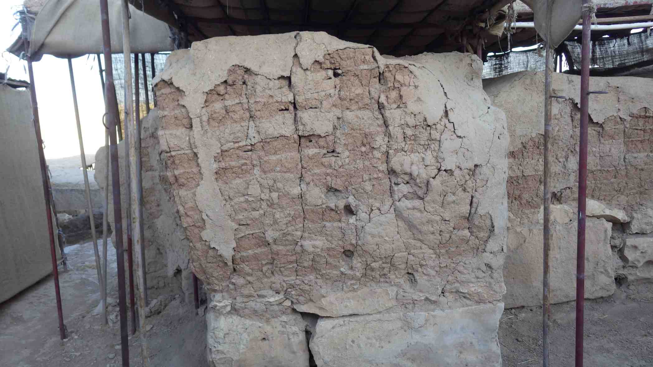 Face of the wall is dry and the mud plaster layer seems to be peeling and some portions did fall off, but nothing serious that would affect the integrity of the wall.