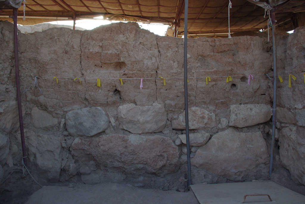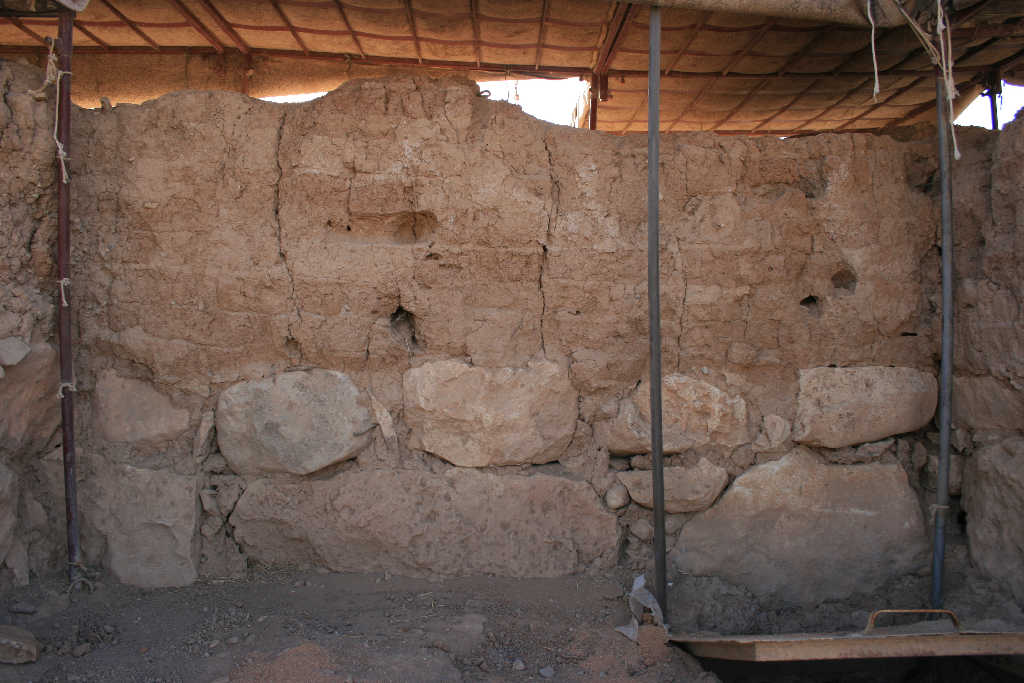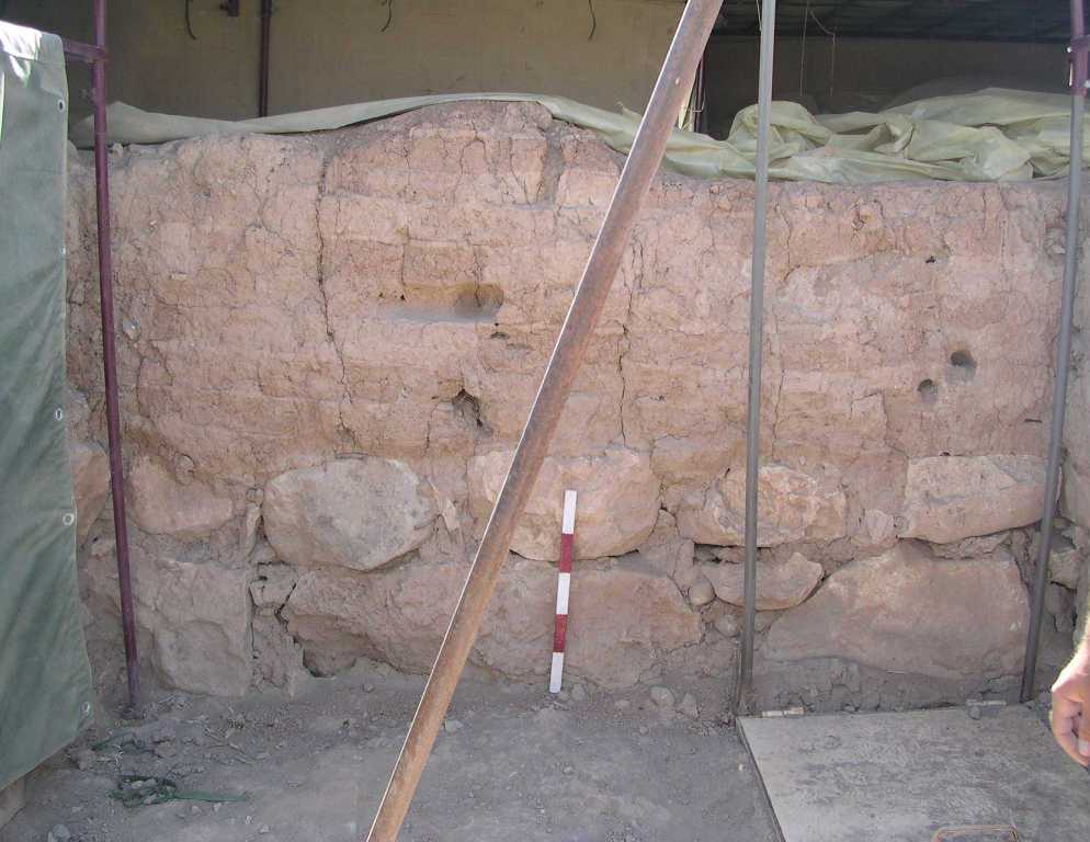 This wall is in fairly good shape, with some minor losses to the surface and slight delamination on the right side above the stones (August 2010, E. Drolet)