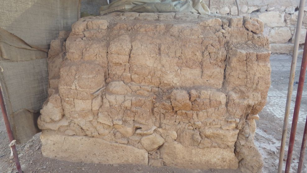 Wall appears dry and crumbly, the wall eroded in both left and right sides of the mud-brick part and lost parts of the mud bricks and the mud plaster. A trace of seeping water is clear in the middle of the wall.