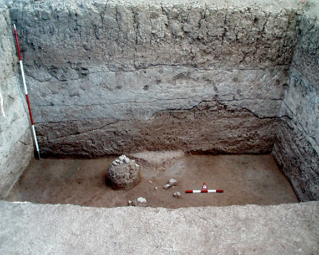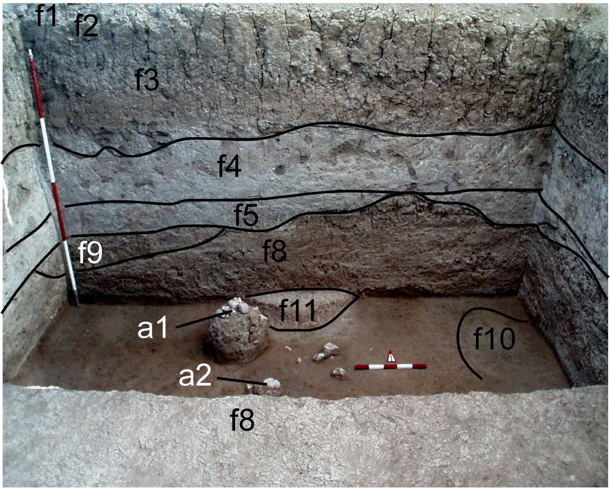 | Notes on analogical record | 1998-7-14 | gB | main view of Northern section at the end of excavation. f9 is scored but is not marked in the section nor was it while digging down. It represents the alternation within f8 of granular and flaky, which we have interpreted alternatively as subfloor and laminations. The patches of stones (some pedestalled within f8) are indicicative of the alignment. [Input file: I714JLW.J / I714JLW.-J] |