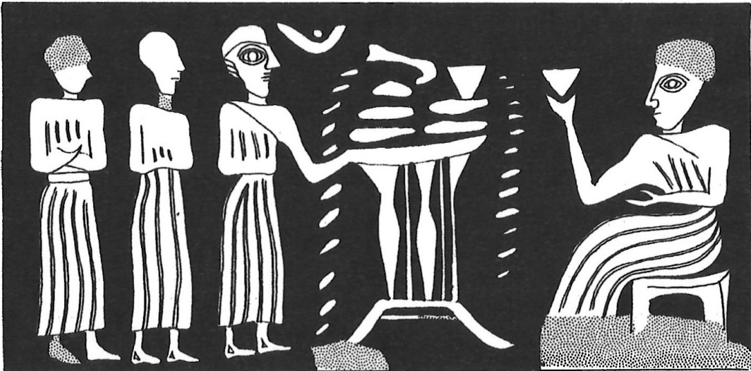 While not all the banquet scenes are carved in the Deep Fringe style (see A9.33) this theme appears important to Urkesh seal cutters and their patrons............say why and get other examples. [but probably not in this page on the deep fringe style?]