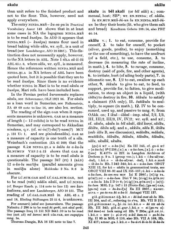 Thus the card shown in the image above, which reproduces a text where a form of the verb akālu occurs, is now embedded in the matching voice in the CAD (volume 1, part 1, pp. 245-259).