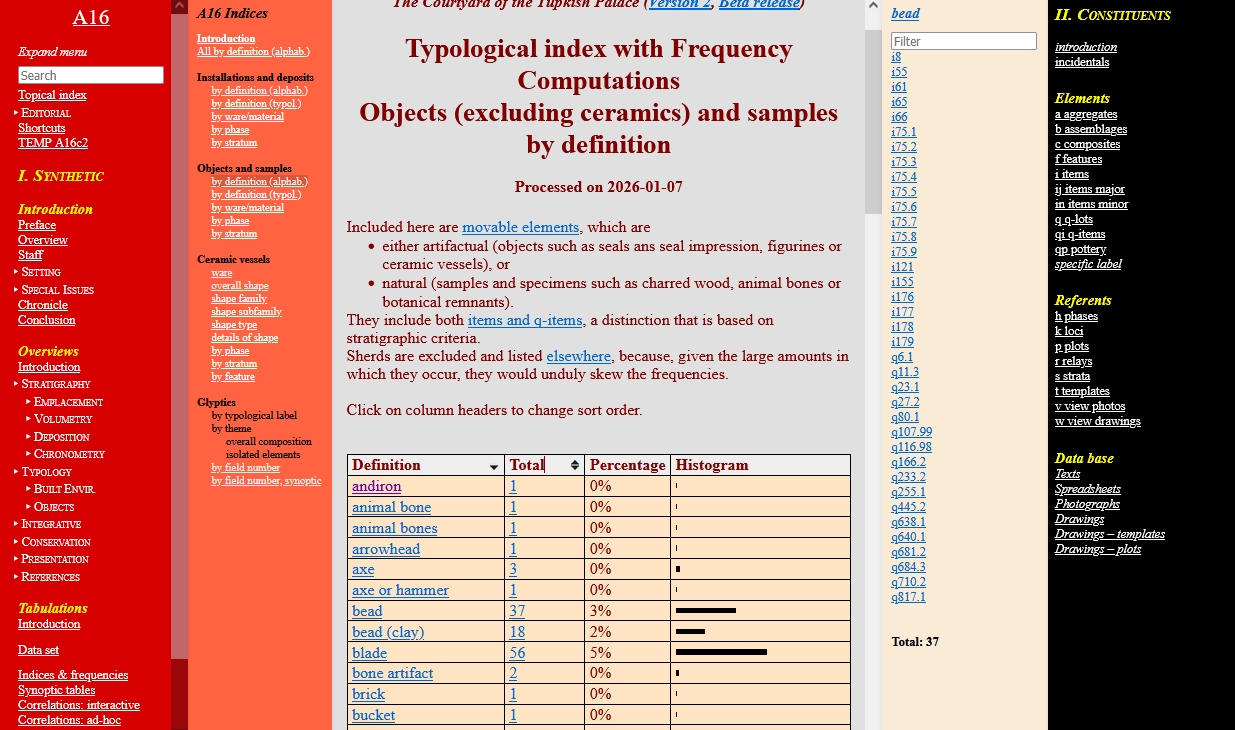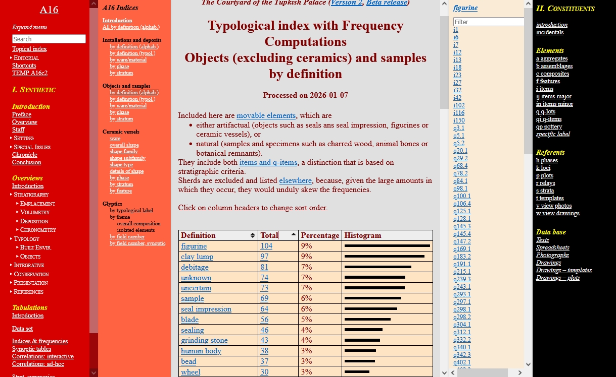 The major innovation afforded by a digital database is the possibility it provides to create instant visual renderings of quantitative information, once the data are stored digitally according to a fully developed categorization. There is almost no limit to the quantity of data that can be processed, and a wide variety of visual configurations are possible, such as bar histograms, pie charts, radar charts.