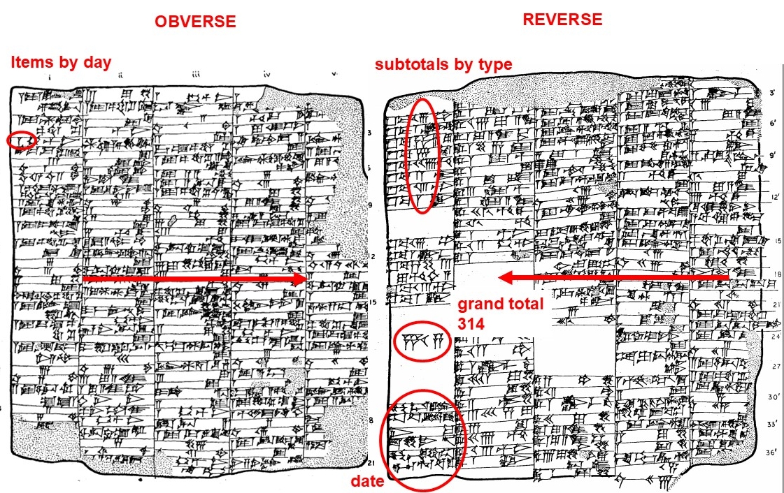 The primary order is thus chronological, but in the last column an alternate order is given: a series of sub-totals by type of animal, followed by the grand total. These totals are set off by extra space on the tablet, which visually highlights their role, as with the date which follows at the very end.