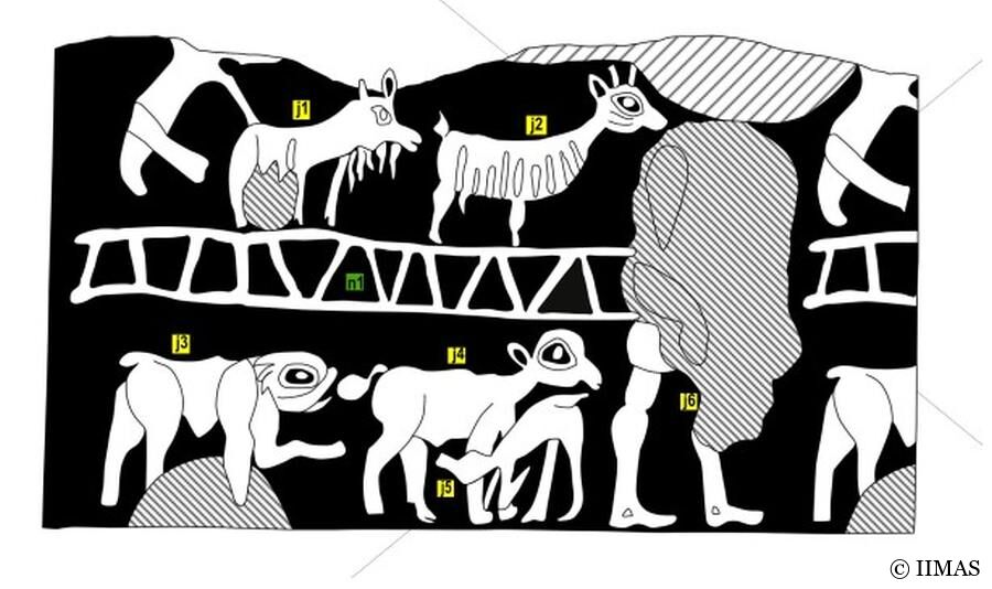 The animals are depicted with standing in profile with a large single eye in front view. Their bodies are formed but the lower caprid with suckling animal is slightly undulating and so more detailed than the others; this is also the case of the tail of this animal. The animal legs are slightly formed but the lion for instance has two legs depicted with geometric shapes. All tails are short, even the lion. We only have the lower body and the legs of the human; the legs have muscular portions depicted and the feet give the detail of the arches. [Input: ZJy20mKB A16si.J] |