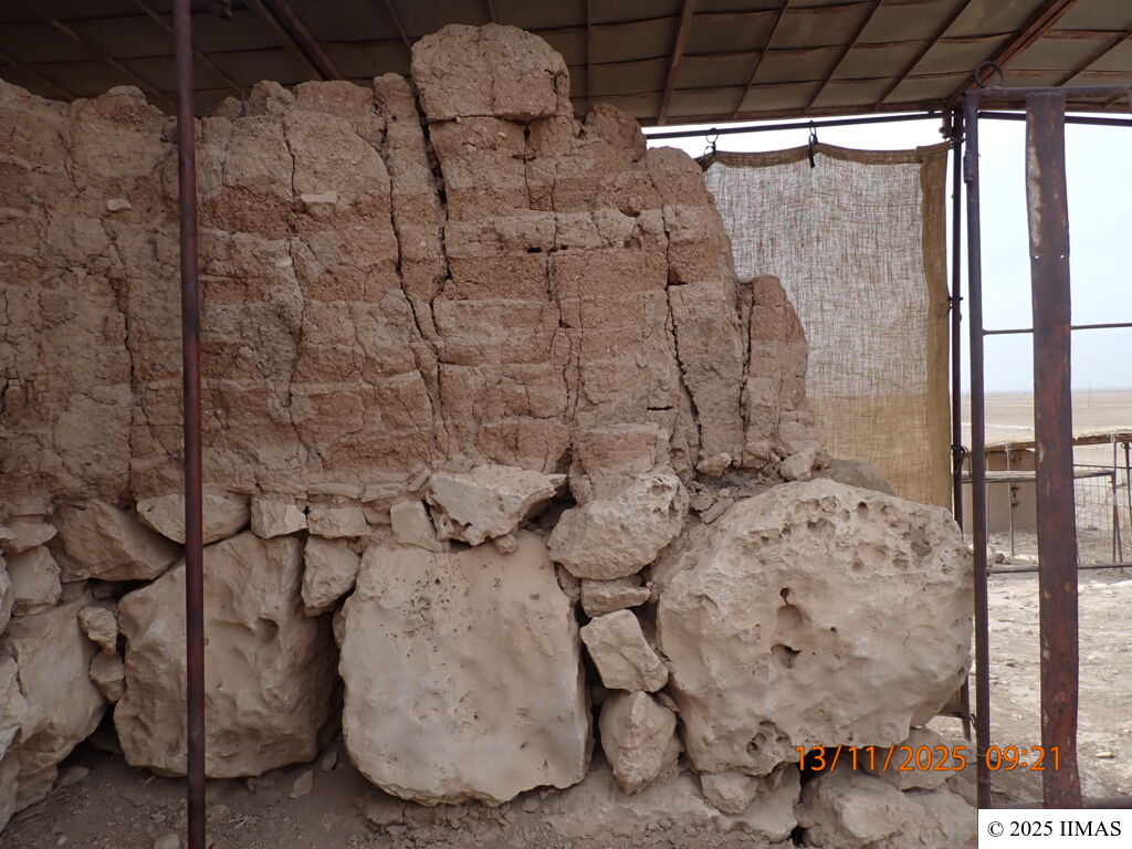 The wall appears to have experienced minor collapse on the right side of the upper mud-brick section, which shows signs of dryness. Cracks have widened compared to previous years. The lower stone section shows no differences from the previous year, with no stone loss, except for slight crumbling of mud bricks on the lower right above the stones.