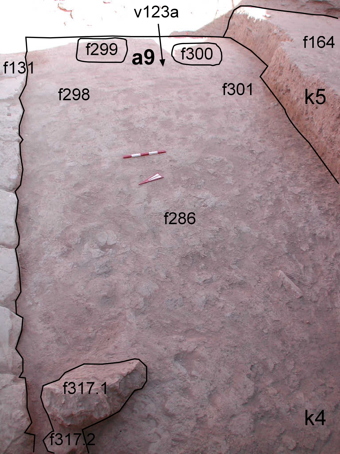 | View/drawing of features | 2004-09-03 | mH | f131 (apron) f164 (lens type d) f286 (accumulation D) f298 (pit-c) f299 (fill) f300 (pit) f301 (fill) f317 (isolated stone) [Input: S204PC2.j] |